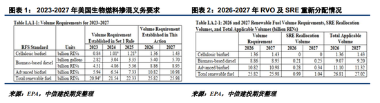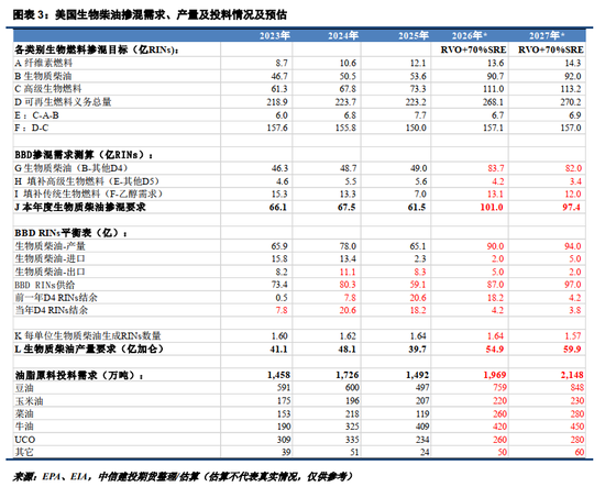 掺混义务加上70%的小炼厂豁免,令2026-2027年美国生物质柴油掺混义务升至90.7亿、92亿RINs,再加上填补其他高级生物燃料和传统生物燃料的需求,生柴的掺混需求将进一步增长。尽管尚有较多结余的RINs可供使用,我们预计美国可再生柴油工厂可能在2027年RINs系数下调窗口前抓紧生产,2026年美国生物质柴油产量有望达到90亿RINs甚至更高水平。按照1.64的系数折算约55亿加仑,对应油脂投料需求近2000万吨,将令美豆油投料需求增至700万吨以上;2027年的美国生柴产量及油脂投料需求则预计进一步增至2000万吨以上,推动美豆油投料需求增至800万吨以上。不过,RINs折算系数的高低对美国生柴的产量要求及油脂投料需求存在影响,且不同原料的投料情况亦需综合补贴及价差情况,仍需根据实际情况进行不断修正。