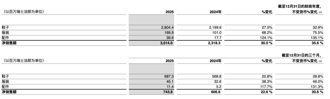 3月初,昂跑(ONON.US)公布2025年全年业绩。营收达30.14亿瑞士法郎,同比增长30%,首次突破30亿关口;按固定汇率计算,增速高达35.6%;毛利率从2024年的60.6%升至62.8%,创历史新高。