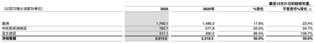 硬币的另一面,其最大单一市场美洲,2025年净销售额为17.40亿瑞士法郎,同比增长17.6%,增速较2024年的27.4%明显放缓;按不变货币口径计算增长23.4%,虽仍保持双位数,但与此前31.2%的增势相比,扩张动能已有所减弱。