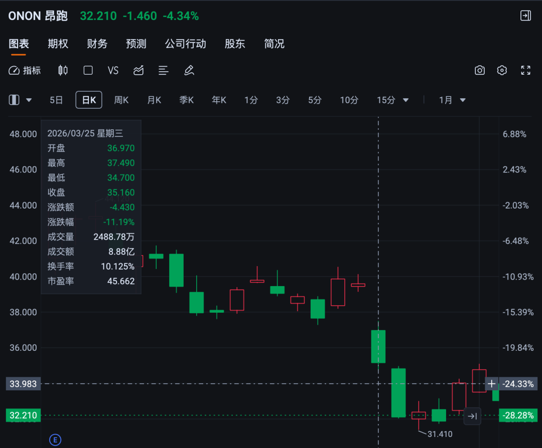 消息公布当天,昂跑股价下跌11.19%,市值蒸发超13亿美元。