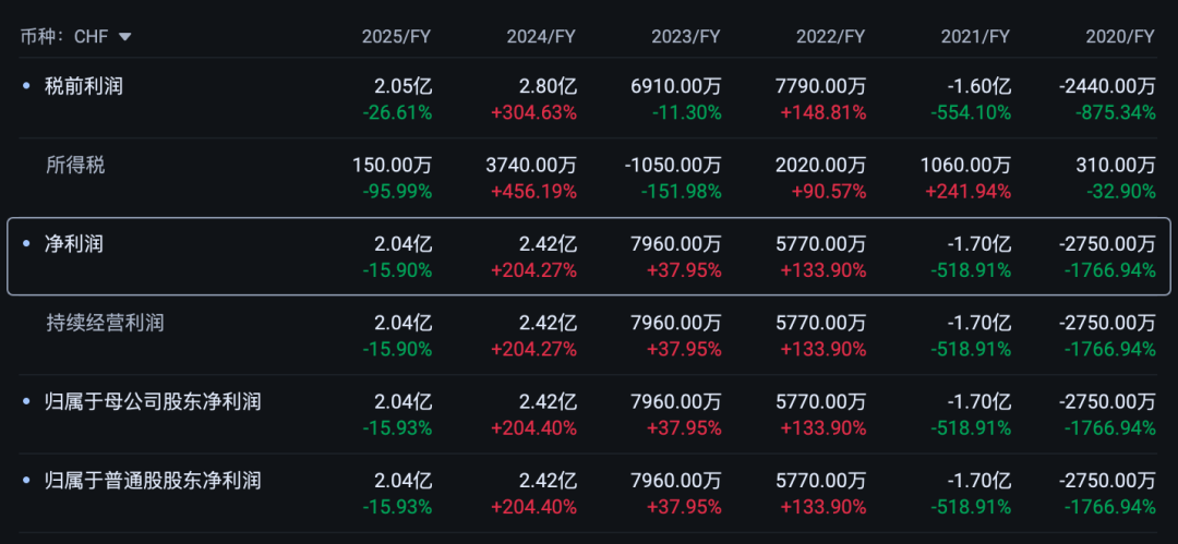 从财务数据来看,他在任期间走出了一条颇具起伏的曲线:2021年净亏损1.702亿瑞士法郎,2022年扭亏为盈,2024年净利润升至2.423亿瑞士法郎(峰值),2025年再度回落至2.037亿瑞士法郎。