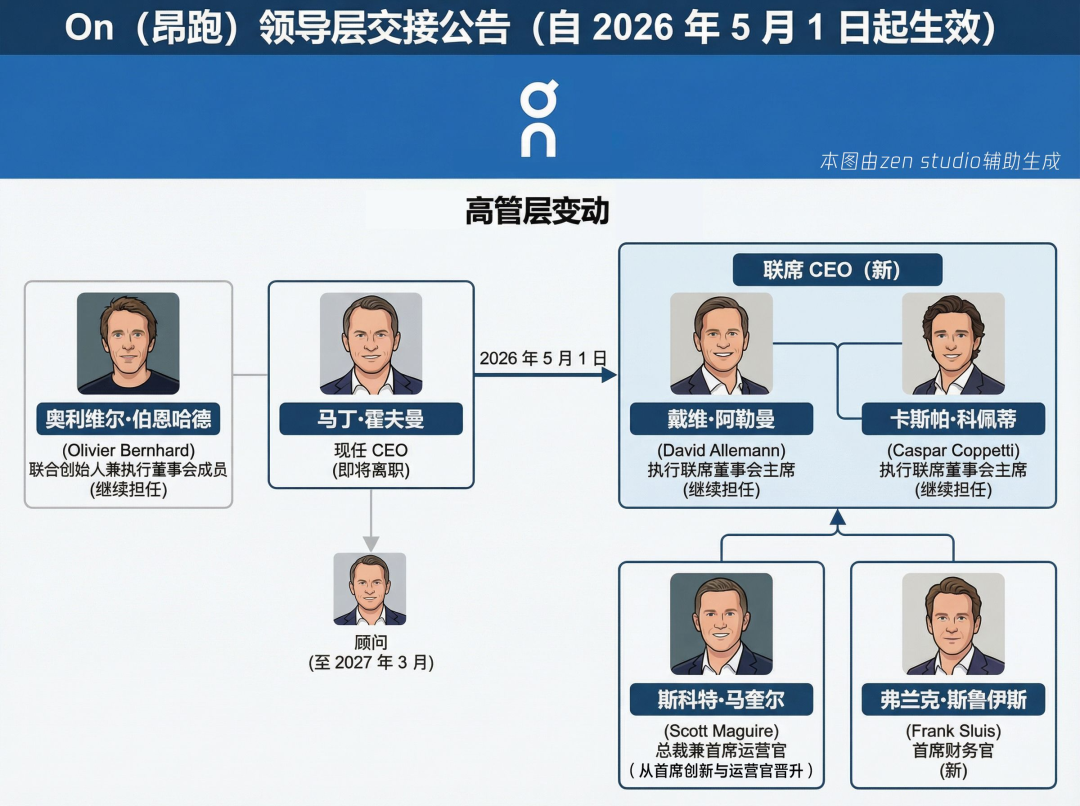 接替他的,不是来自知名鞋服品牌的外部高管,而是昂跑的两位联合创始人:大卫·阿勒曼(David Allemann)与卡斯帕·科佩蒂(Caspar Coppetti)重返一线,共同出任联席CEO,同时继续保留董事会执行联席主席的职位。