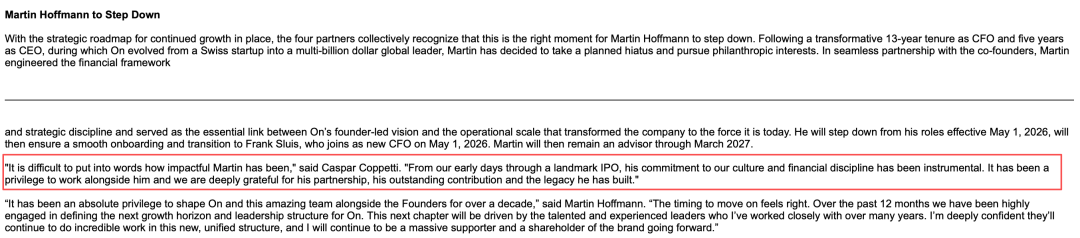 3月底,昂跑发布公告,现任CEO马丁·霍夫曼(Martin Hoffmann)将于2026年5月1日正式离任。